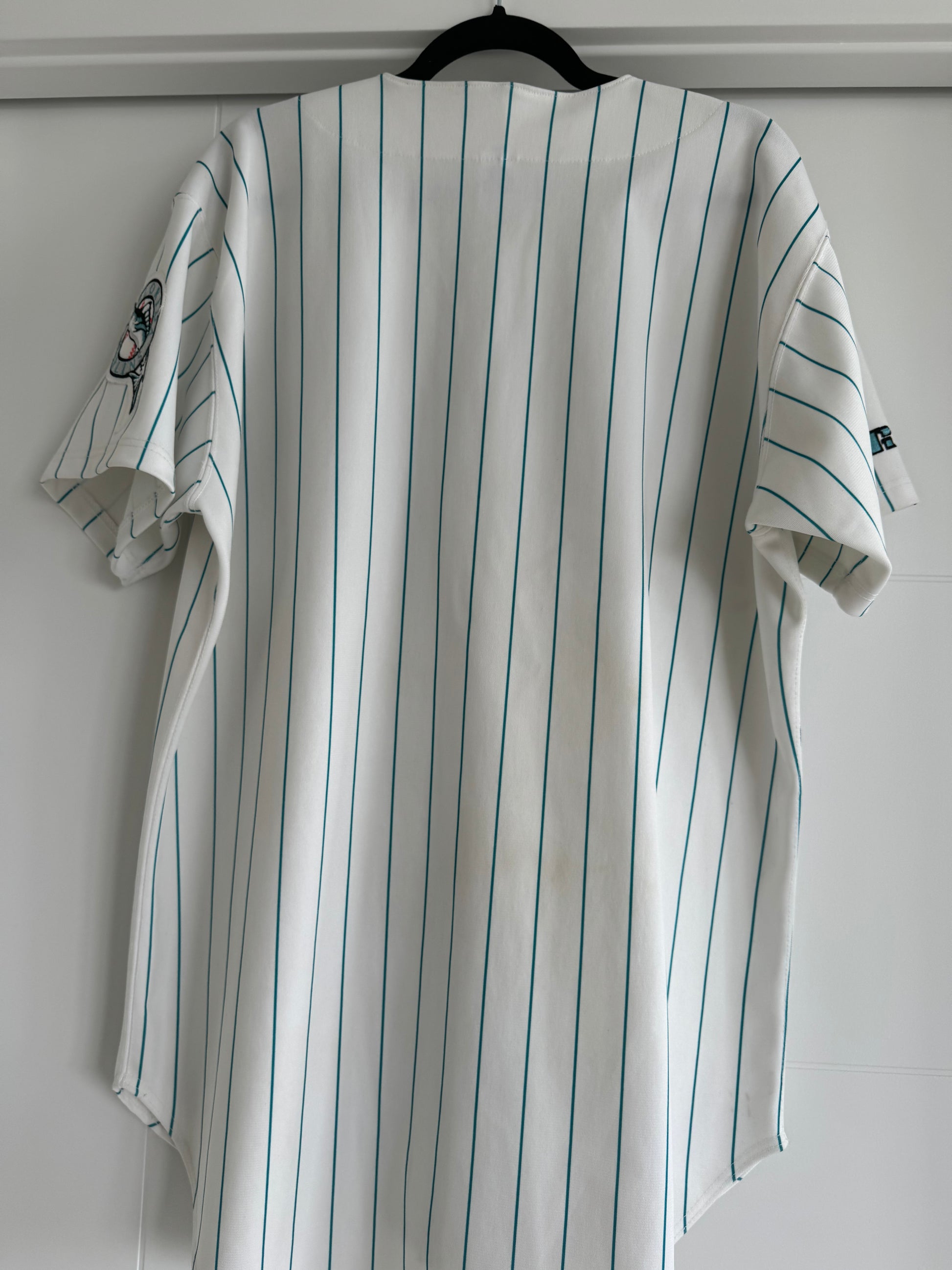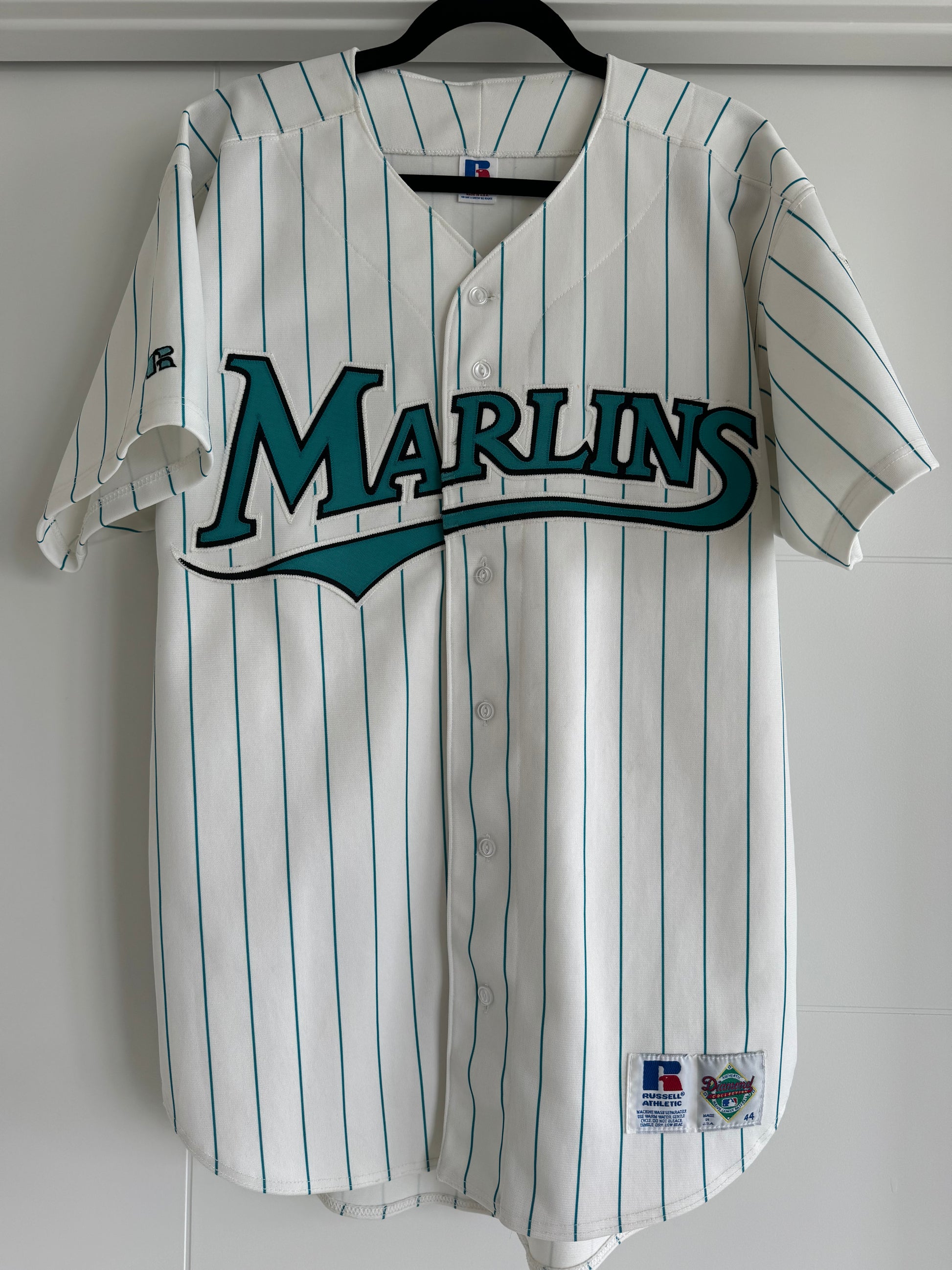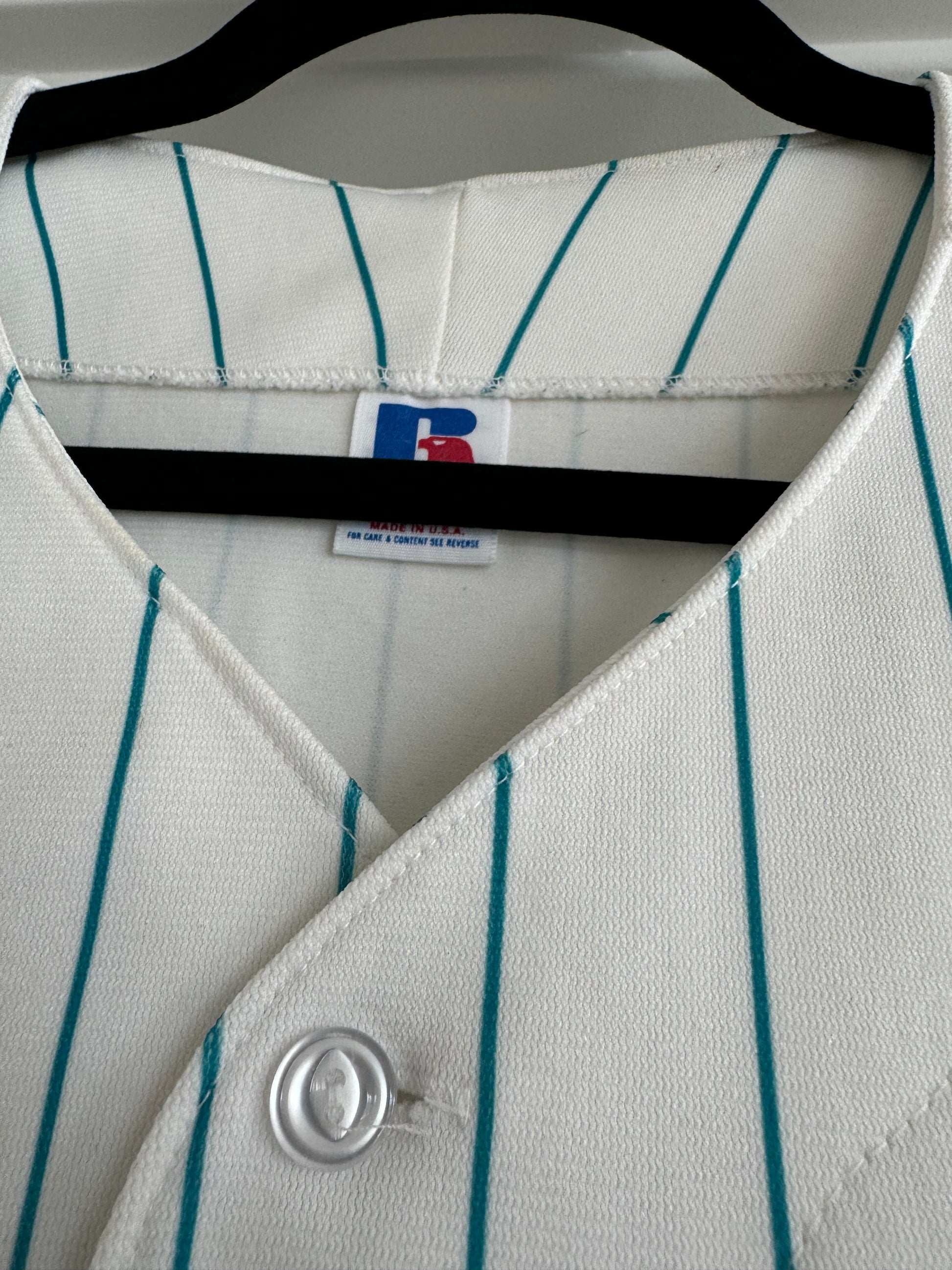 This is an Authentic Russel Athletic Teal pinstripes Jersey. The same style the Marlins wore at home from 1993-2002.