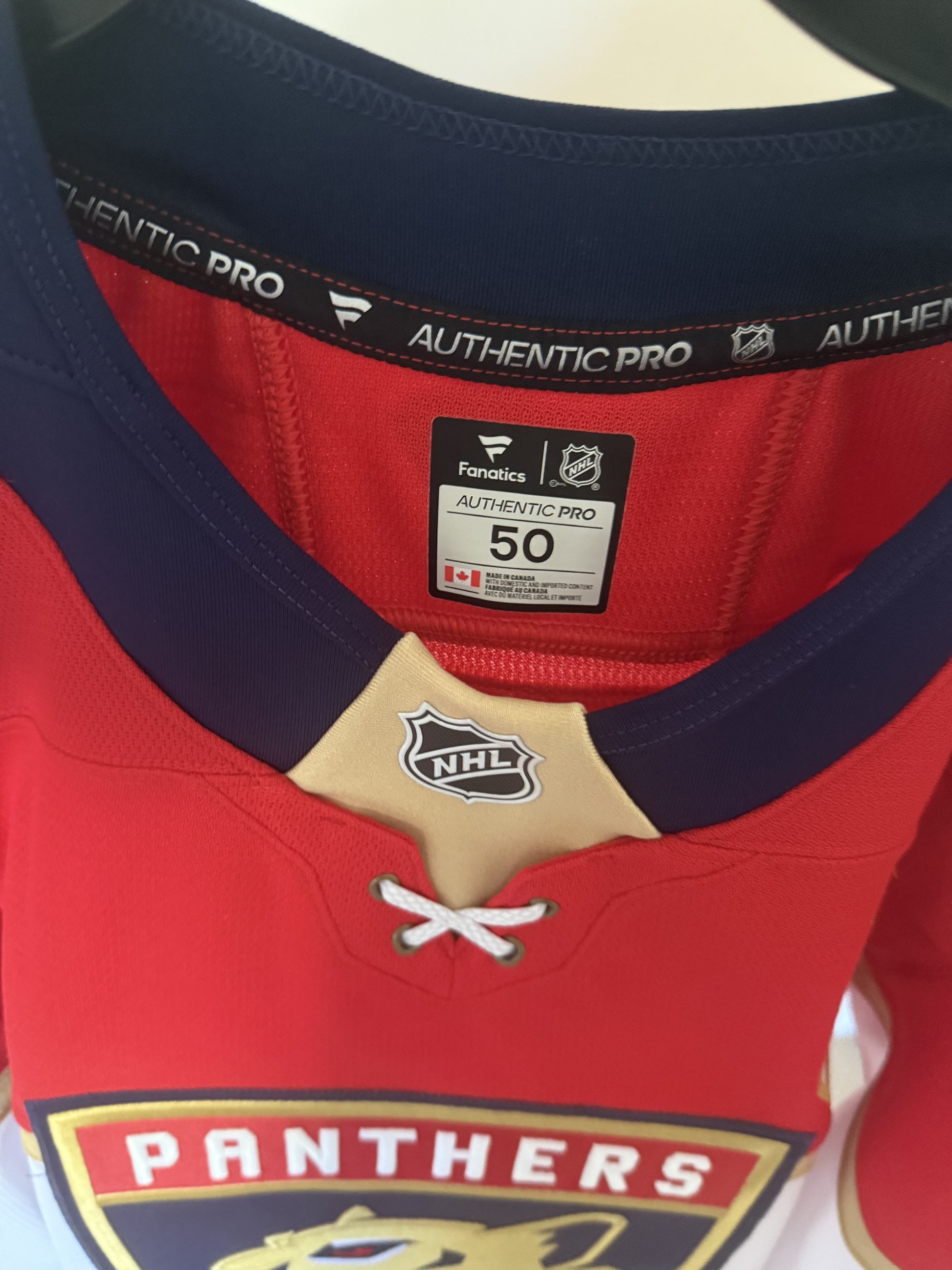 New with tags this is an Aleksander Barkov Made in Canada Fanatics Authentic Pro. The exact same model that the players wear on the ice. You can see that the sleeves are wider to fit pads.