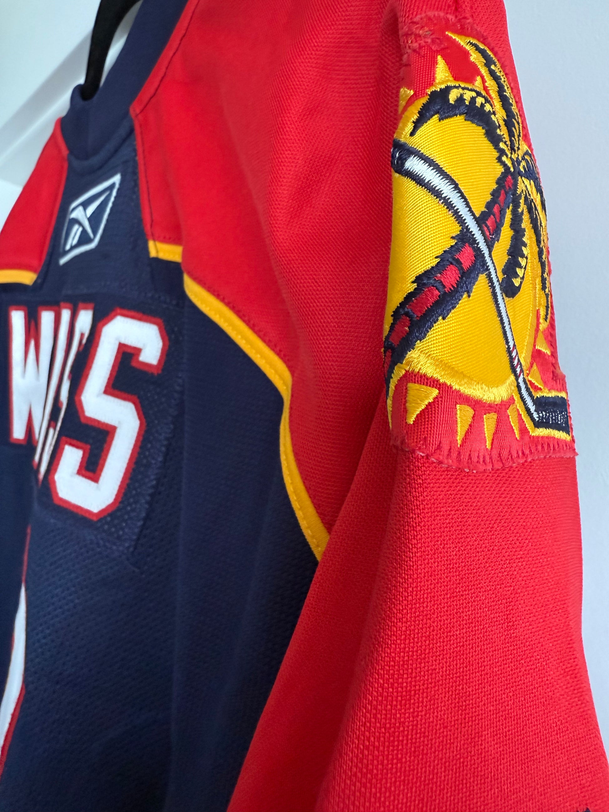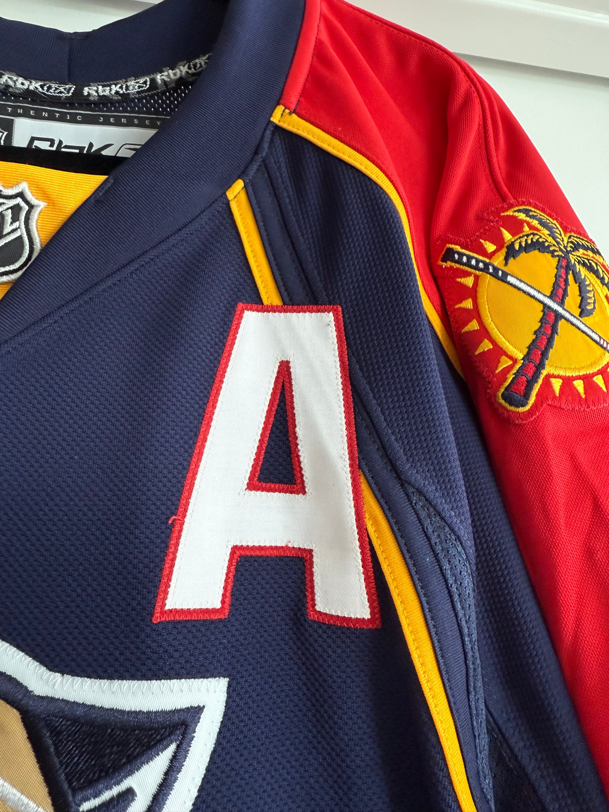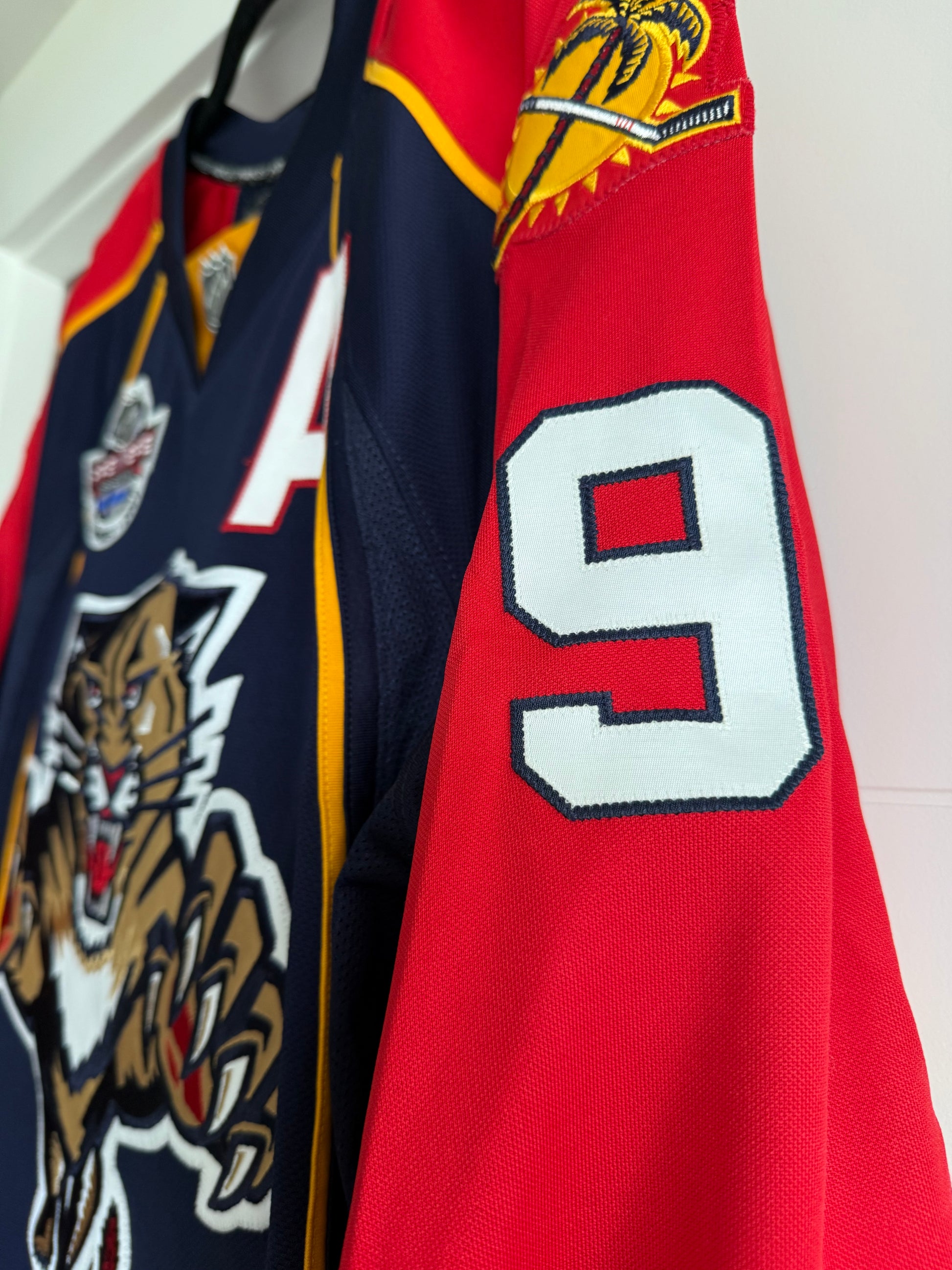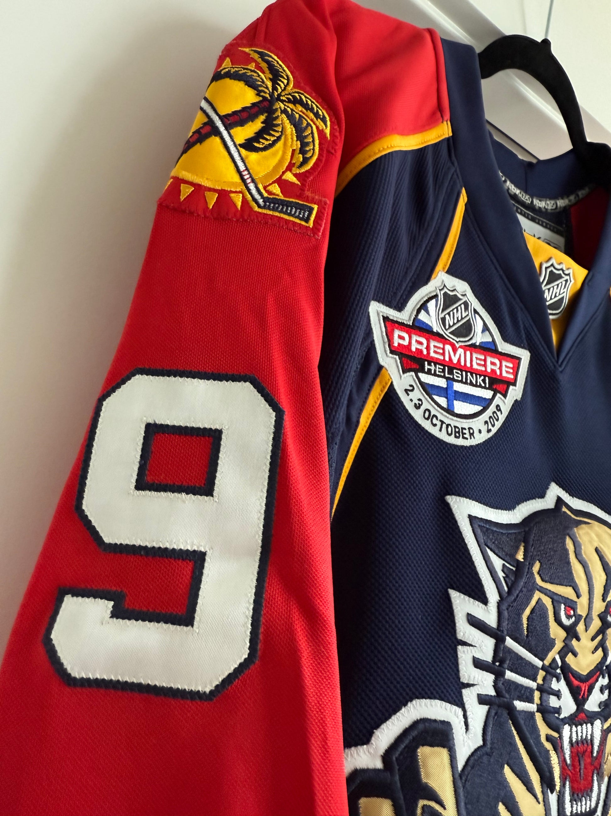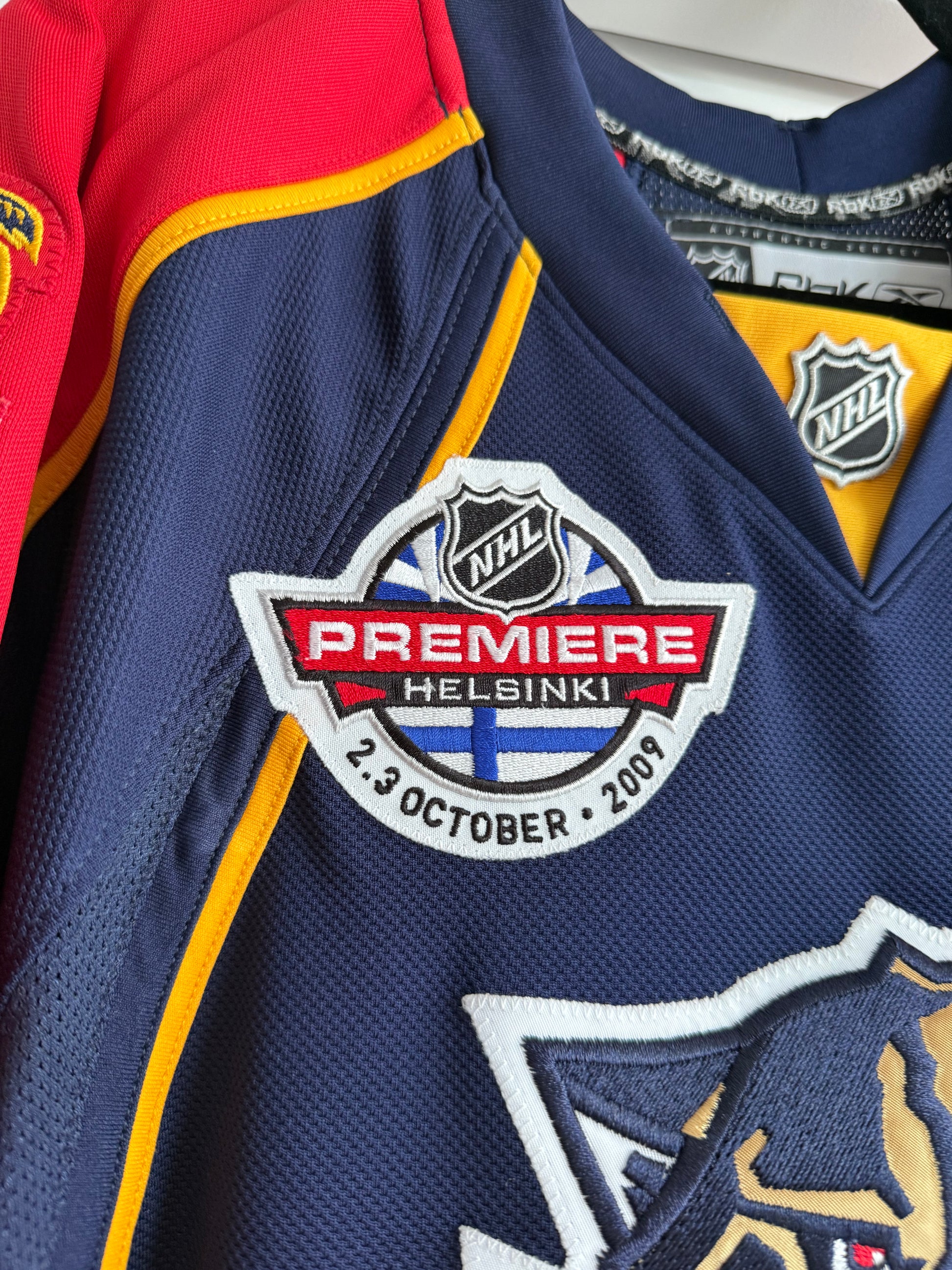 The jersey features the 2009 Finland Premiere Games in which the Panthers played 2 games vs the Blackhawks in Helsinki to open the season.